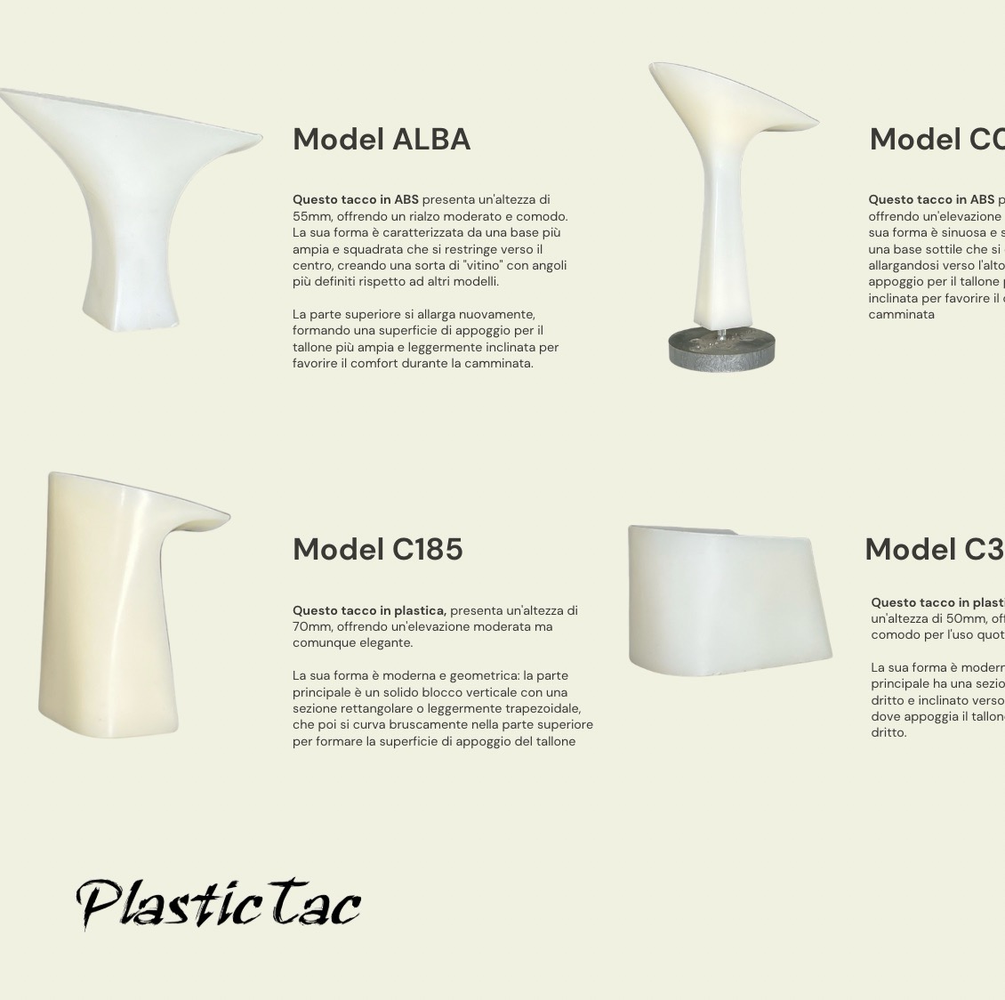 Abbiamo realizzato un catalogo con tutti i modelli che produciamo. Se sei interessato a tacchi in ABS made in Italy, questo è il posto giusto.